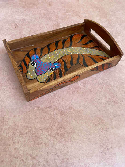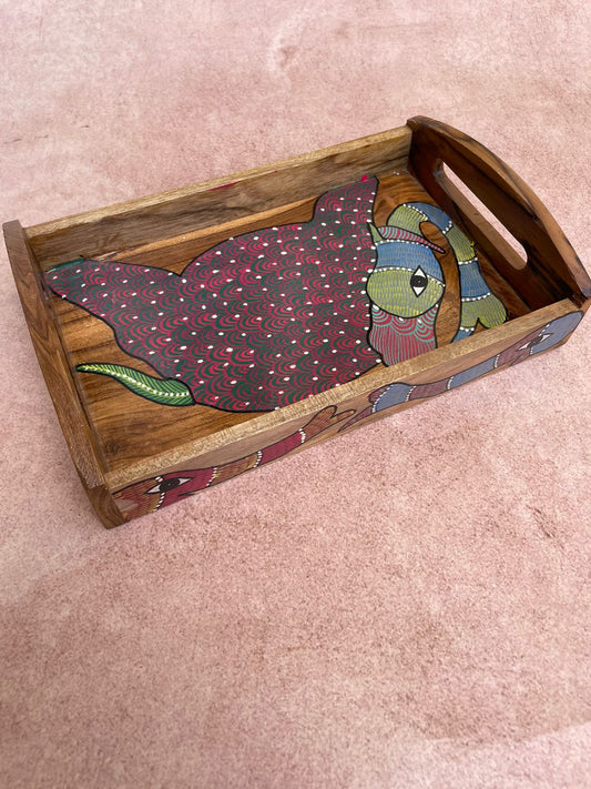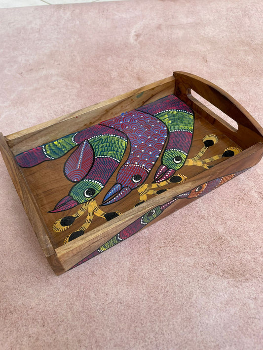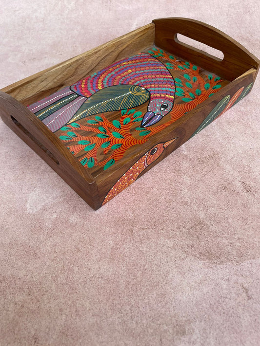 Gond Wooden Peacock Handpainted Tray ( Large )