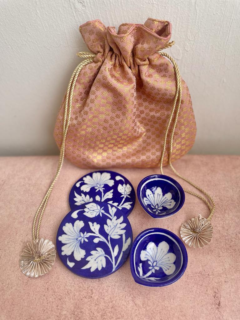 Note: The potlis are made by women rehabilitated from bonded labour. They are trained on skills such as tailoring and embroidery. The women currently make these products from the comfort of their home town in Ramanagara, karnataka. And the blue pottery coasters and diyas are made by rural artisans from Kotjewar, Rajastan.